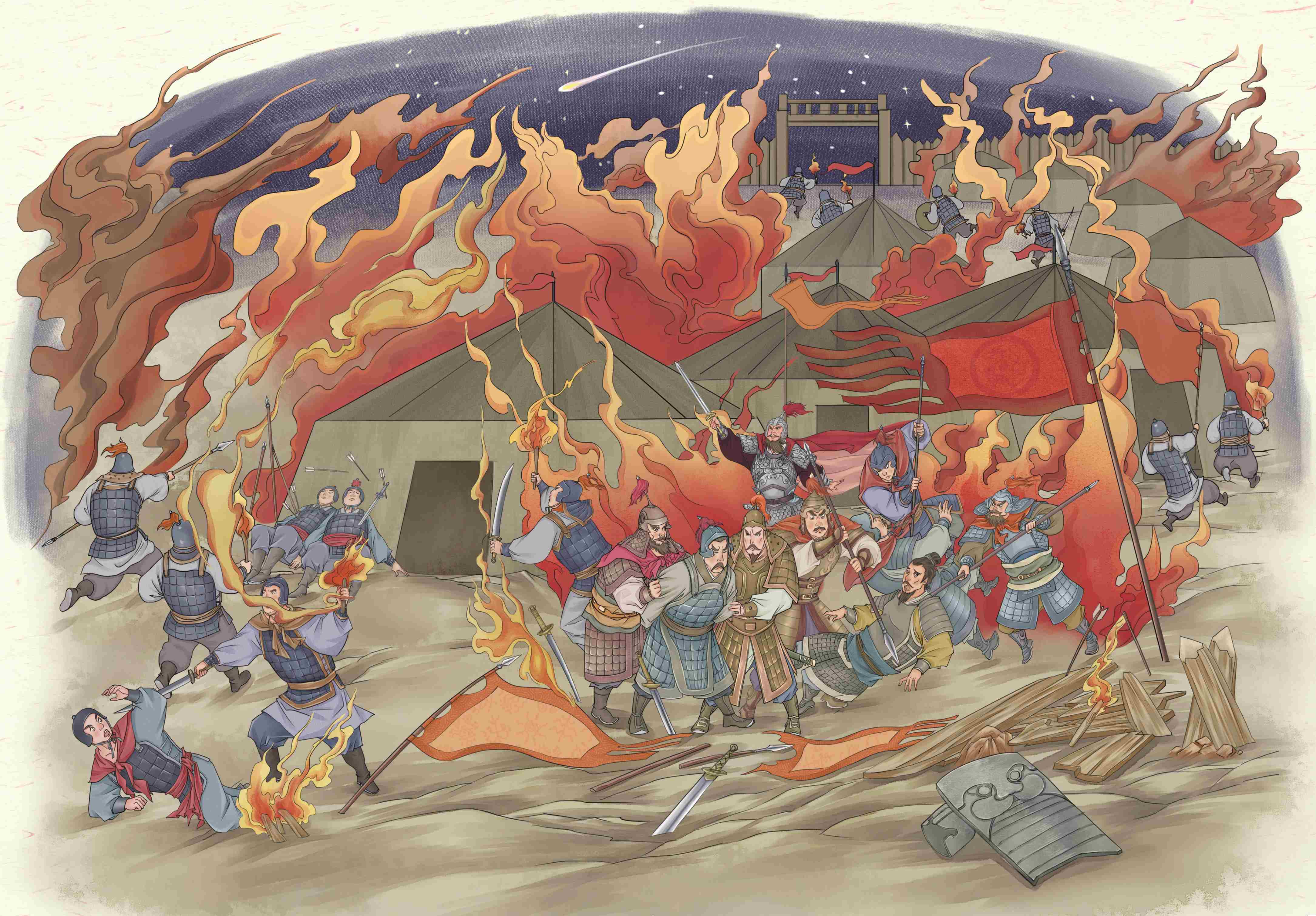 曹操在营中正要歇息,闻听许攸前来投奔,大喜过望,鞋也顾不上穿便跑了出去,亲自将许攸迎入帐内。许攸探问曹操还有多少军粮,曹操不肯明言,许攸道:“休瞒我,军中粮草已尽。再不速胜,是自取灭亡。”曹操愕然,忙问取胜之法。许攸道:“袁军粮草尽数屯于乌巢,守将淳于琼终日饮酒,乌巢唾手可得。”曹操立即亲率精兵五千,打着袁军旗帜前往乌巢,诈称是蒋奇的兵马,混入寨中,放起火来,霎时间火焰腾空。袁绍连忙召集众文武商议。郭图提议不救乌巢、直击曹营,张郃却说攻曹营风险太大。袁绍犹疑不决,便兵分两路,让张郃、高览引兵五千攻打曹营,蒋奇引兵一万援救乌巢。曹操打败淳于琼后,便命众军士伪装成淳于琼的败军下山,正遇上蒋奇兵马,又杀死蒋奇,派人伪报袁绍说:蒋奇已打败乌巢曹军。袁绍毫不起疑,便不再派军援救乌巢。