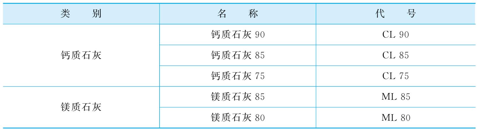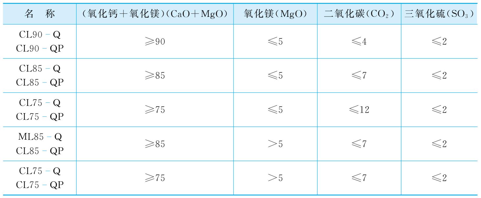 根据《建筑生石灰》(JC/T 479—2013)的规定,按生石灰的化学成分,建筑生石灰分为钙质石灰(CL)和镁质石灰(ML)。钙质石灰是主要由氧化钙或氢氧化钙组成,而不添加任何水硬性的或火山灰质的材料。镁质石灰是主要由氧化钙和氧化镁(MgO>5%)或氢氧化钙和氢氧化镁组成,而不添加任何水硬性的或火山灰质的材料。