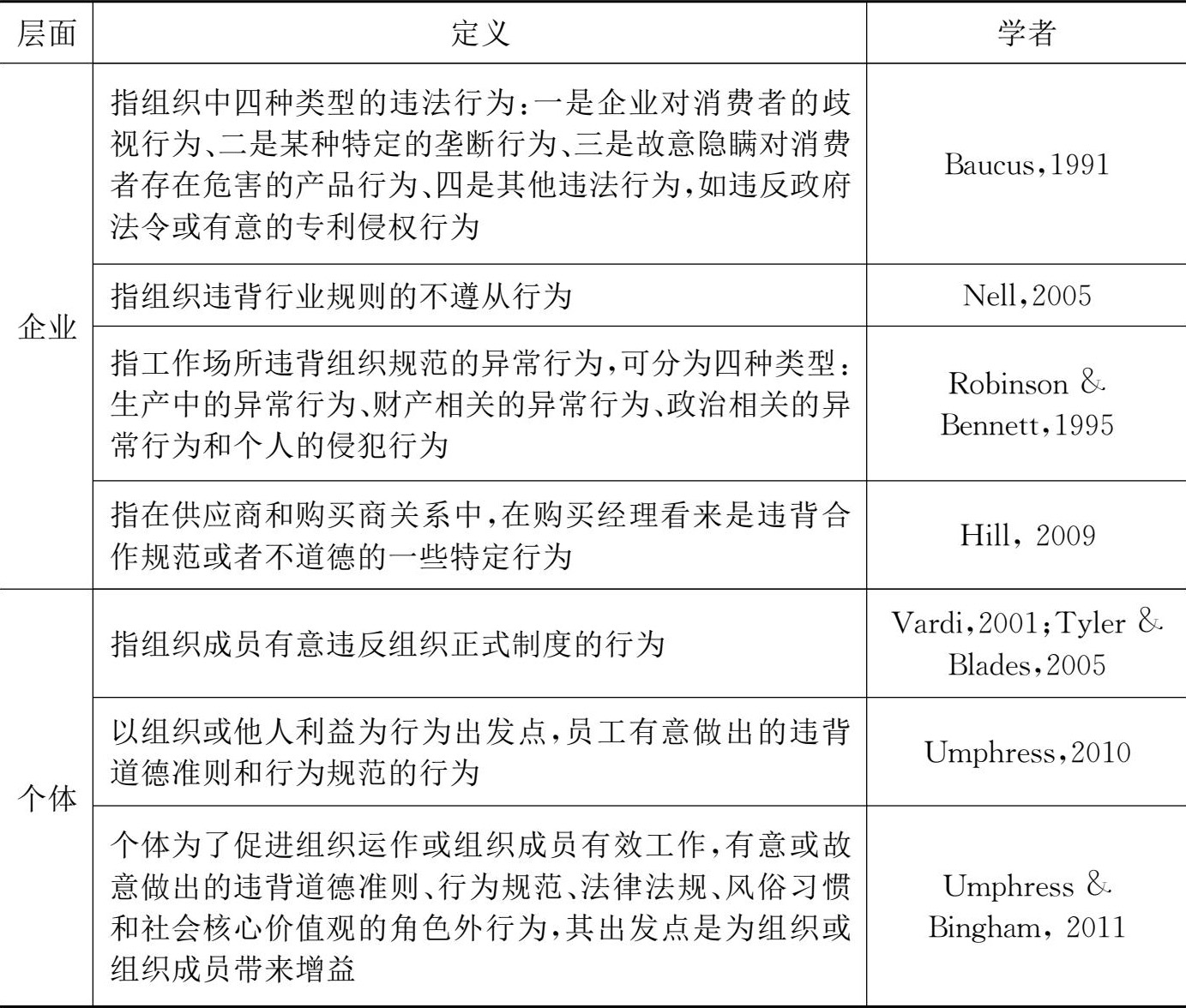 组织层面的不道德行为指企业利用法律法规在某些方面的疏漏以规避监管和约束而进行违反企业道德、企业制度、社会规范、合作伙伴关系规范等一系列行为(Baucus, 1991),如商业贿赂、污染环境、出售“问题”产品、盘剥员工、违规用工等。如苏丹红事件、沃尔玛欺诈客户、瘦肉精、地沟油等事件。表1-1列出部分研究者对个体层面和组织层面不道德行为的定义。