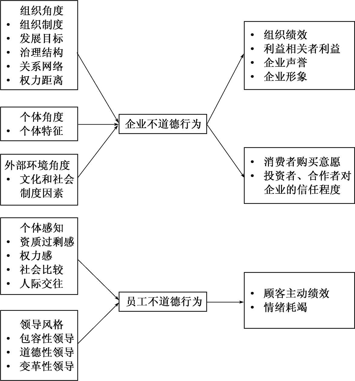 对于不道德行为的影响结果,研究指出企业不道德行为不仅会长期影响企业的组织绩效、损害企业利益相关者的利益,还会影响消费者对企业产品的购买意愿,进而损坏企业声誉、企业形象;同时还会降低投资者、合作者对企业的信任程度,降低企业可靠性(Baucu等,2006;Hill等,2009)。亲组织不道德行为虽然短期可为企业组织带来一定收益,但最终会损害个人及组织的长期利益,如影响顾客主动绩效,使顾客对企业产生不信任、不可靠的认知,以及降低企业认同感等。长期的亲组织不道德行为还会使员工的心理和情绪资源受到损坏,并出现情绪耗竭的状态(王桃林等,2020)。对不道德行为的前因与后果的研究如图1-3所示。