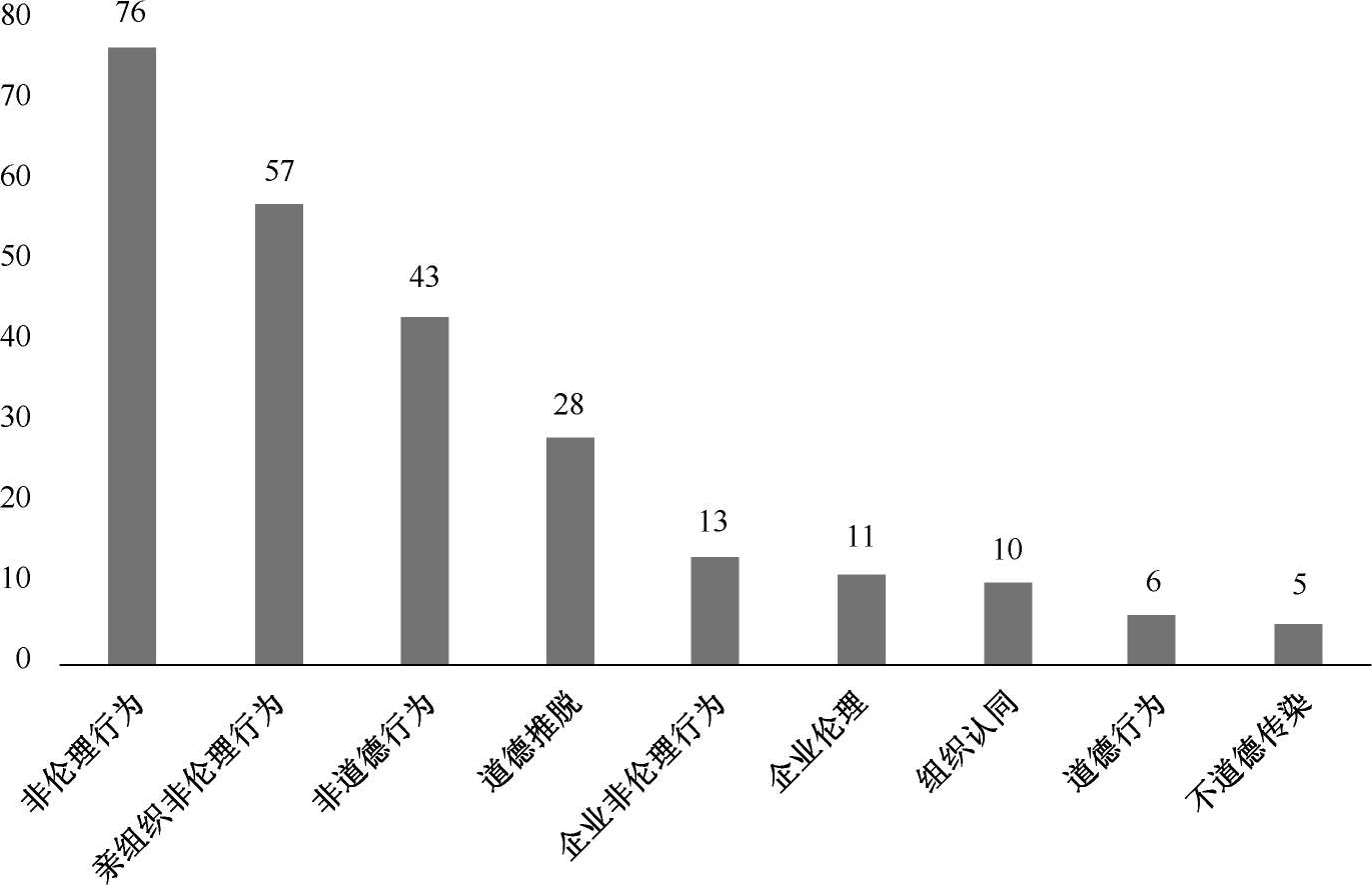 (2)不道德行为影响:为提高企业以及管理者对不道德行为的关注,学者们探究了不道德行为的影响,如员工之间的不道德行为传染、影响同事的道德判断等。