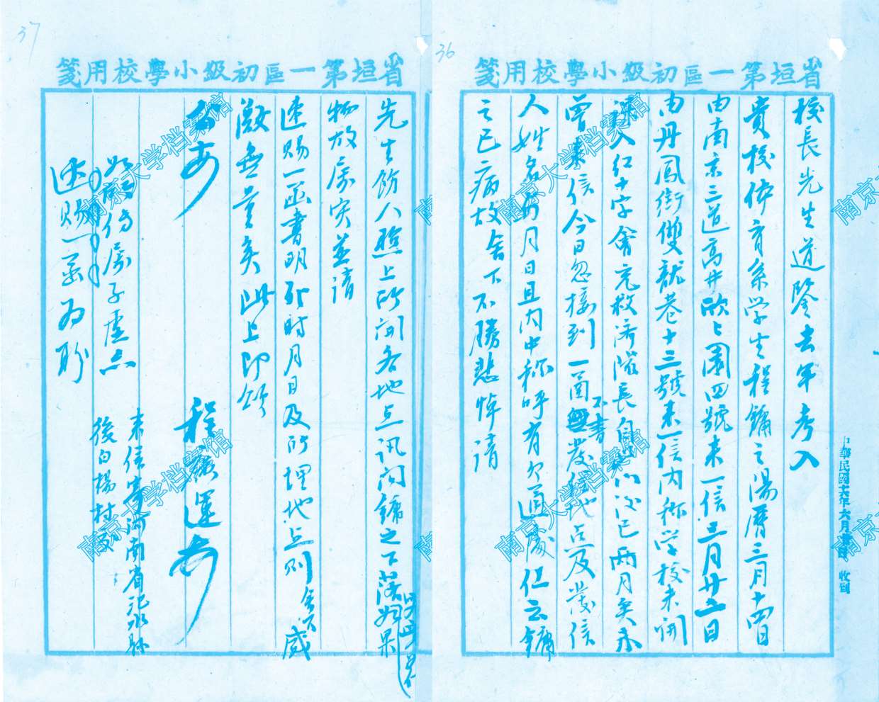 去年考入贵校体育系学生程镛之阳历三月十四日由南京三道高井欣上园4号来一信,三月廿二日由丹凤街双龙巷十三号来信,内称学校未开课,入红十字会充救济队长。自此以后已两月矣未曾来信。今日忽接到一函,不书发信地点及发信人姓名与月日,且内中称呼有欠通处,但云镛之已病故,舍下不胜悲悼,请先生饬人照上所闻各地点问询镛之下落,究竟如何?如果物故属实,并请速赐一函,书明死时月日及所埋地点,则舍下感激无量矣。