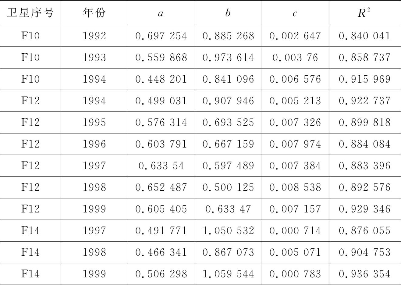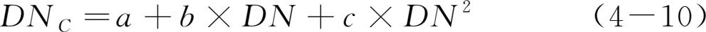 (2)参考影像校正。借鉴Elvidge等 [193] 对夜间灯光影像数据的DN值校正方法,选择黑龙江鸡西市为参考区,以2007年F16卫星的影像数据为参考数据,将其他年份预处理后的影像数据与参考数据分别构造二次回归模型(式4-10),得到相关年份DN值校正参数(表4-3)。 R 2 值均大于0.84,模型的拟合效果较好。因此,本研究利用该参数校正1992—2013年中国稳定夜间灯光影像的DN值。