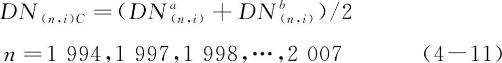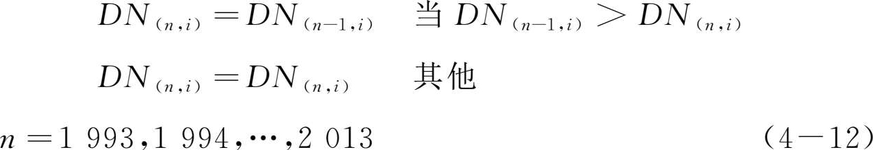(4)年际校正。根据稳定夜间灯光影像的特点,夜间灯光影像前一年的DN值应小于等于后一年的DN值。参照公式(4-12),对经过参考影像校正和年内融合后的影像进行年际校正。