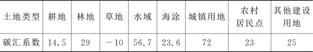 长三角地区河湖众多,水网密集。河湖水面具有一定的固碳能力,依据段晓男等 [169] 对东部地区的研究结果,确定水域碳汇能力为56.7 t·km -2 ·a -1 ,海涂碳汇能力为23.6 t·km -2 ·a -1 。