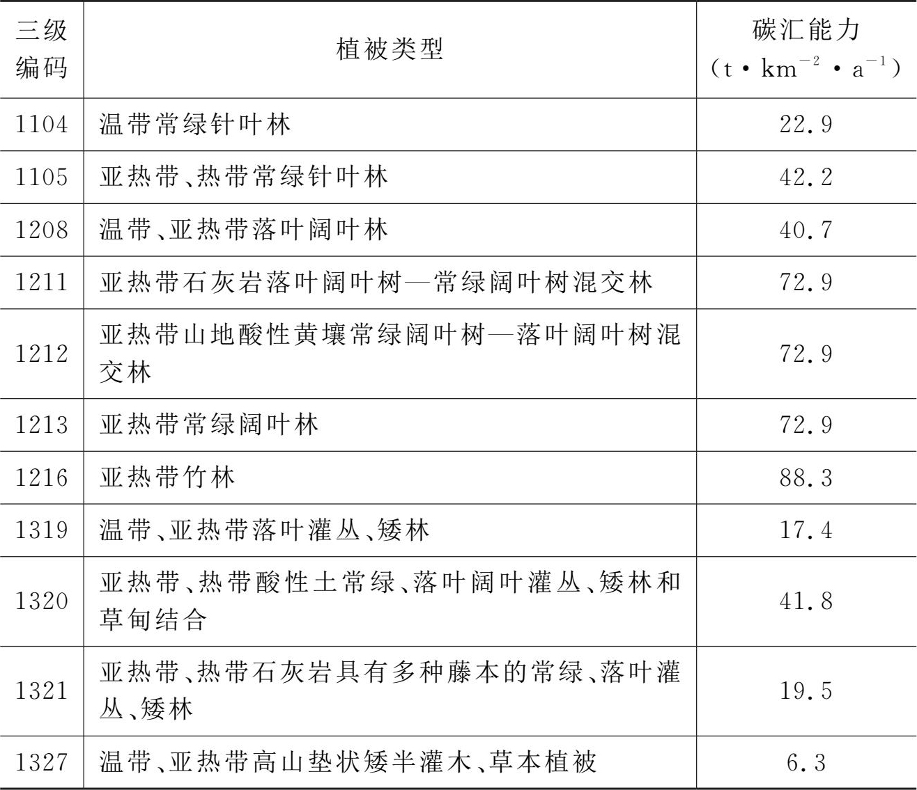 (3)草地。长三角地区草地植被类型主要为温带草甸植被,借鉴赖力 [163] 的研究结果,草地碳汇能力确定为7.7 t·km -2 ·a -1 。