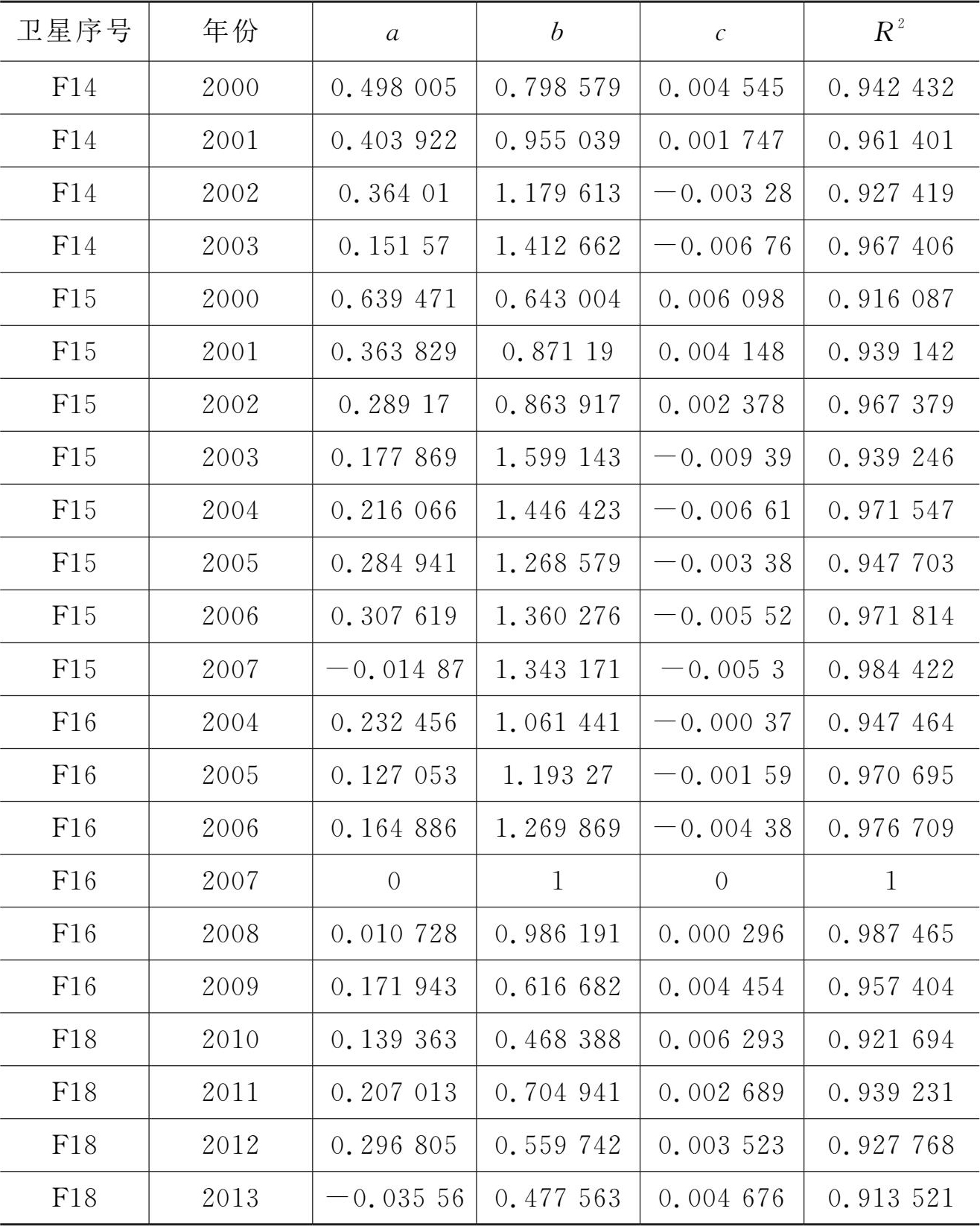 式中, DN C 和 DN 分别表示校正后和校正前影像的DN值, a 、 b 和 c 表示回归参数。