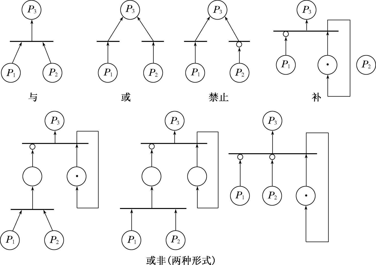 在随机Petri网中,变迁是用来描述系统所处的状态事件。库所是用来描述系统可能处于的局部状态,如系统中元器件所处的运行、失效或者维修状态。令牌是库所的一部分,令牌的动态变化能够表示系统及元器件所处的状态。弧是用来描述事件及局部状态间的关系,有两种描述方式:一种是引述事件发生的局部状态;另一种是利用事件引发局部状态转换。由上述定义与、或、禁止、补、与非、或非等逻辑关系均能用Petri网表示。(如图3-17所示)