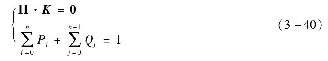 式中, P i 表示稳态情况下处于位置 p i 的概率, Q j 表示稳态情况下处于位置 q j 的概率,Π是元素为 P i 、 Q j 的稳态概率矢量, K 为变迁状态转移矩阵。