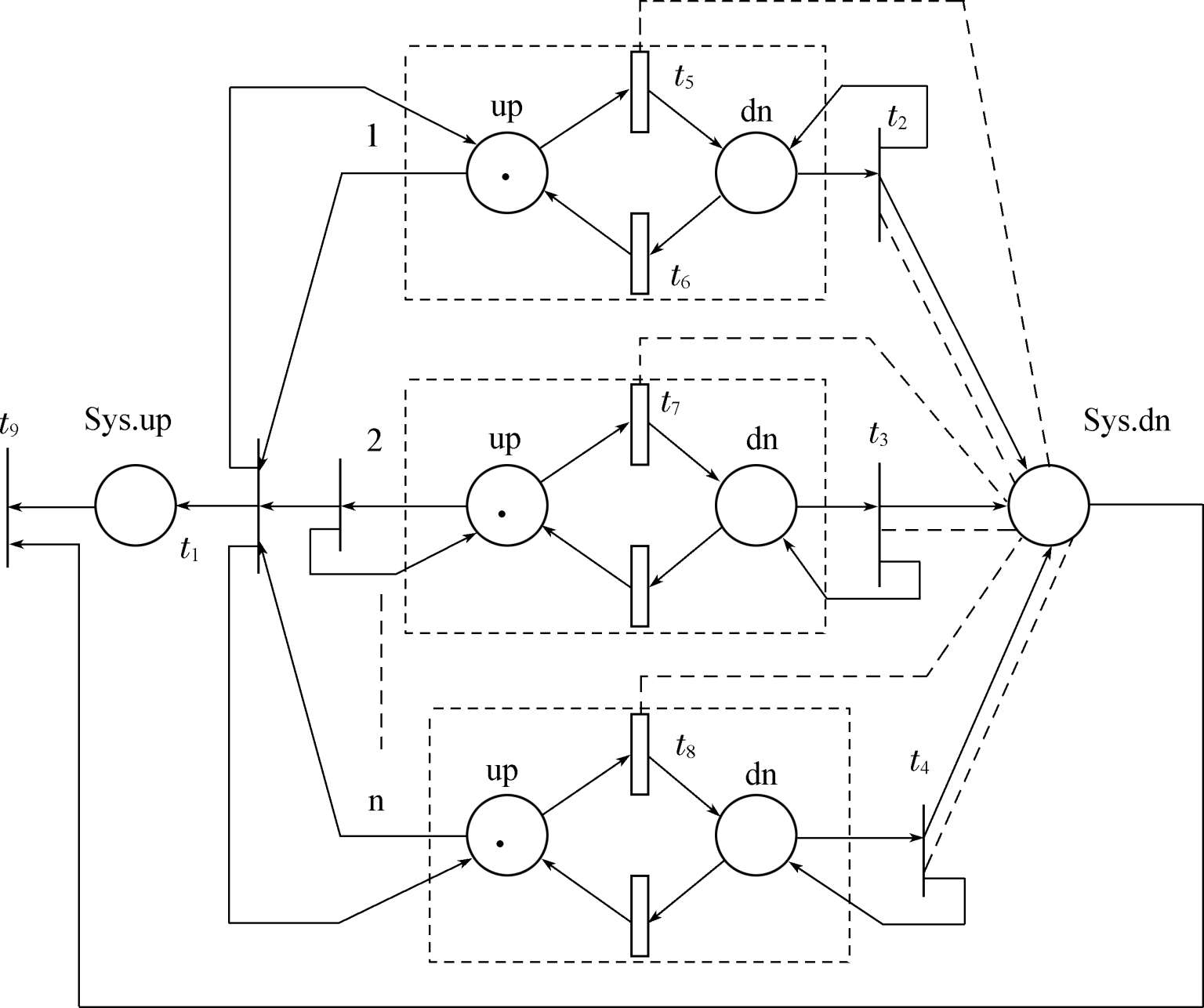 图3-18为串联系统的随机Petri网模型。其中,元器件出现故障用dn表示,元器件正常工作或者等待工作时用up表示。一个串联系统由n个独立元件组成。