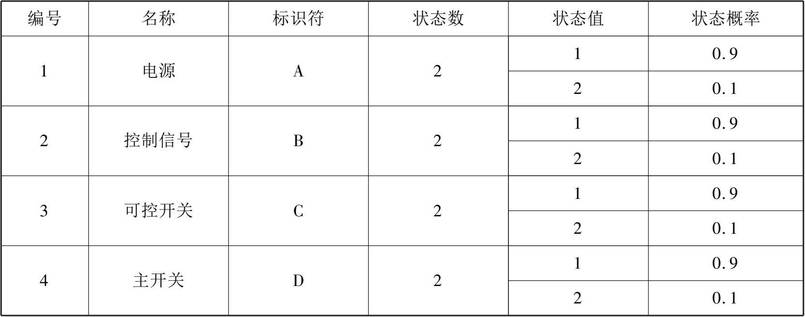 [例3-2] 图3-22是某电源系统的系统结构,以及用GO图表示的系统模型。(图3-23)。假设静态系统状态(状态1为成功,2为故障)和概率如表3-7: