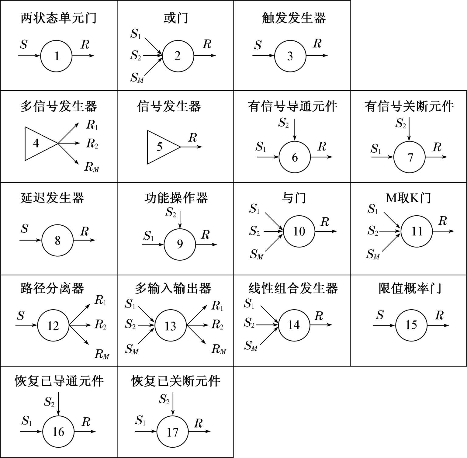 系统中的部件、元件或子系统可统称为单元。 GO法中的操作符代表单元功能和单元输入、输出信号之间的逻辑关系,有类型、数据和运算规则三种属性。其中,类型为操作符的主要属性,用来反映操作符所代表的单元功能和特征;数据和运算规则从属于类型的属性。不同类型的操作符表示不同的单元功能或单元间的逻辑关系,因此也就有规定的单元数据要求和规定的运算规则与之相对应。 GO法中已经定义了17种标准操作符,如图3-20所示。