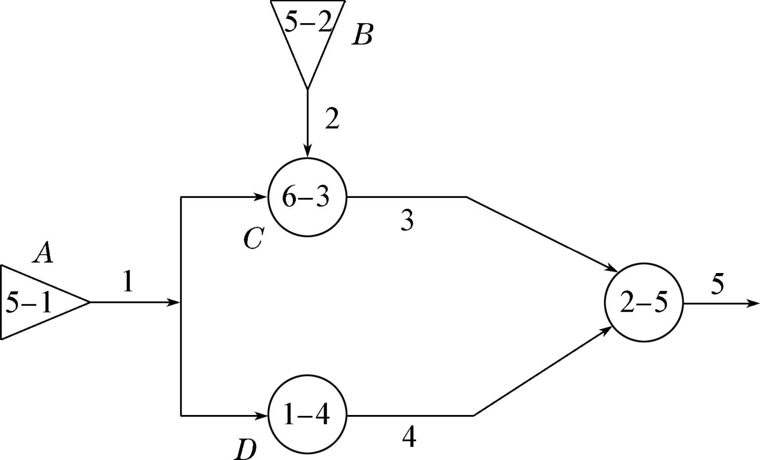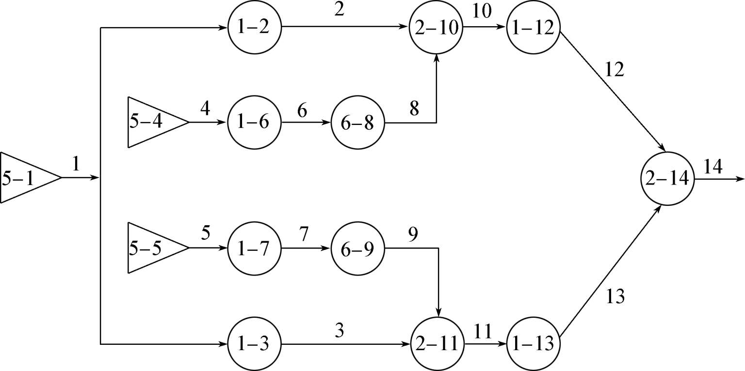 以含一个共有信号的电力系统为例,建立其GO图如图3-21所示。图中,后一位数字表示操作符编号;连接线上的数字表示信号流编号。可见图中共有4种不同形式的操作符,