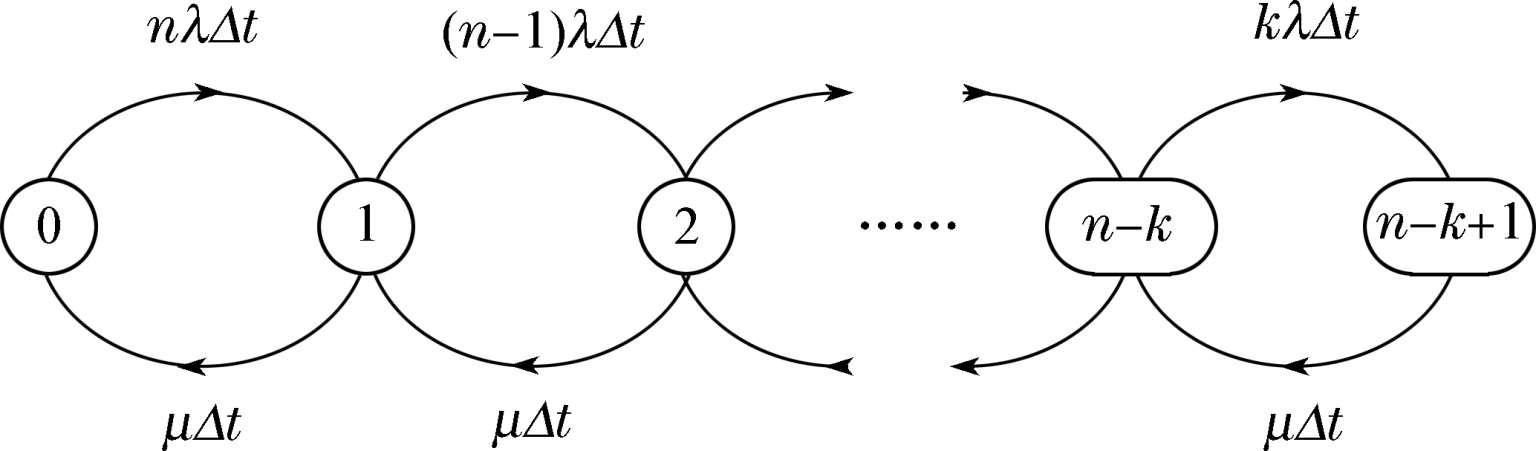 2)当有 n - k + 1个部件故障时,系统故障。在系统故障期内, k -1个正常部件停止工作,不再发生故障。直到正在修理的部件修理完成, k 个正常的部件同时进入工作状态,此时系统重新进入工作状态。
