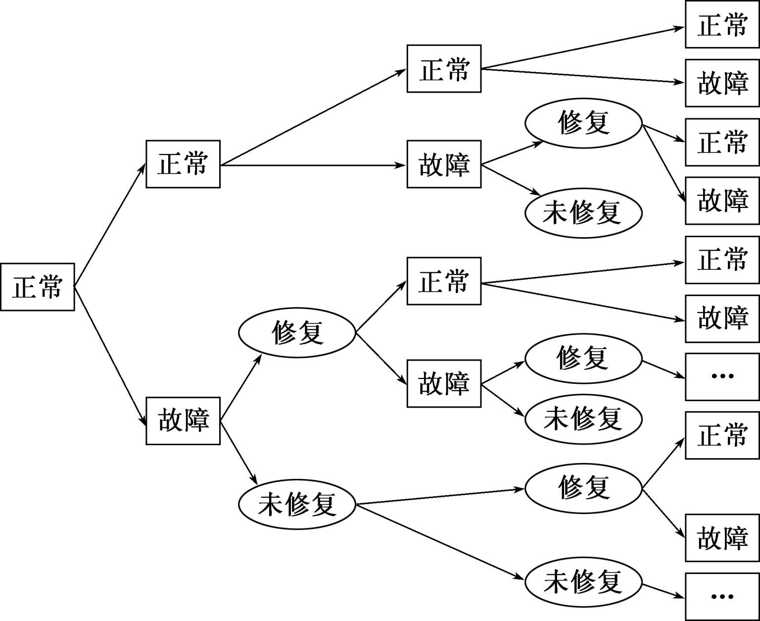 对于单位组件的定期检修,如果需要用精确算法,则需要按照每一期检修的结果和维修后是否修复进行逐步分析,最终形成归纳计算。如图3-27所示。