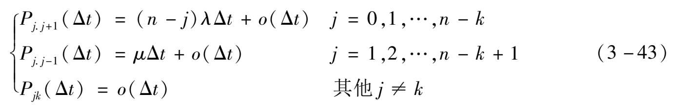 定义 X ( t )= j,j =0,1,…, n - k + 1,表示时刻 t 系统有 j 个故障的部件(包括正在修理的部件)。可知{ X ( t ), t ≥0}是状态空间 E 的齐次马尔科夫过程,Δ t 内的状态转移概率为: