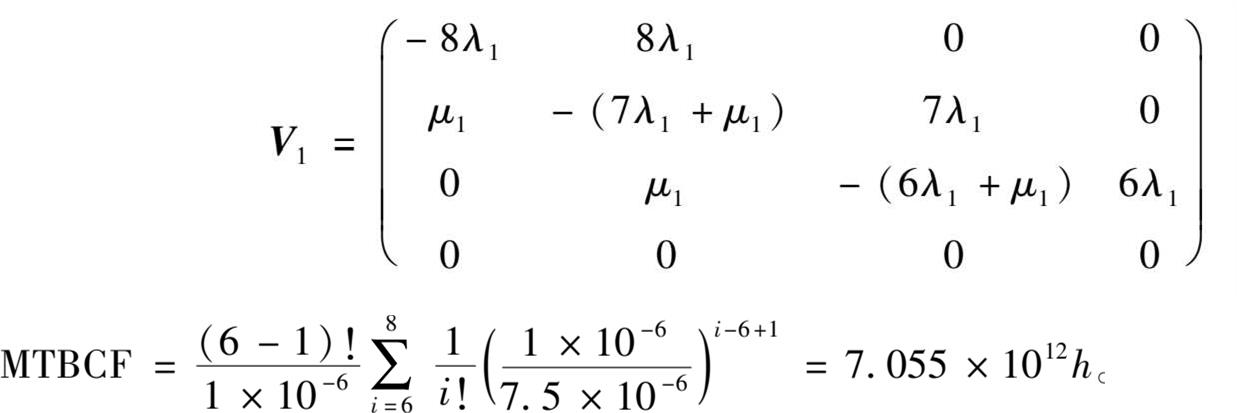 [例3-3] 信息处理设备采用了8取6表决设计,且可在线维修,求解MTBCF。