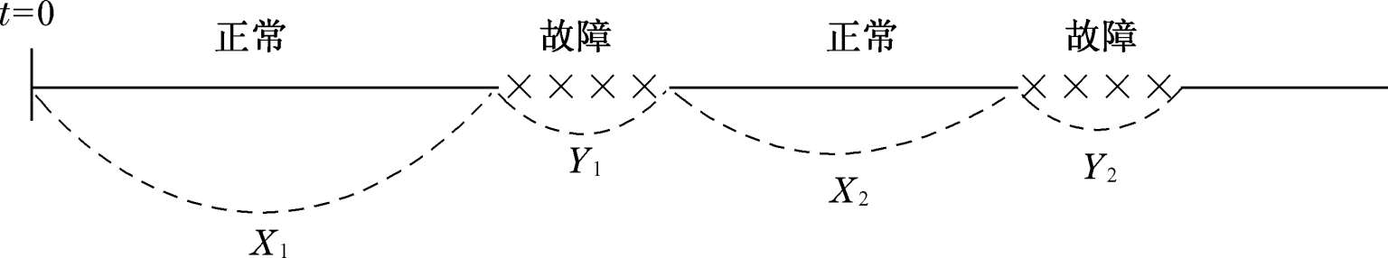 为了提升系统任务可靠性,可在不关机的情形下直接维修或替换发生故障的单元、组件。对于在线维修系统和定期检修系统等可修系统,主要的可靠性指标包括系统首次故障时间分布、可用度(包括稳态可用度和瞬时可用度)、可靠度、(0, t ]中系统的平均故障次数(故障频度)、系统平均故障间隔时间等。不同领域产品对可靠性指标关注的侧重点有所不同,上述指标则从各个方面反映了可修系统的可靠性。可修系统的可靠性数量指标,如图3-24所示。