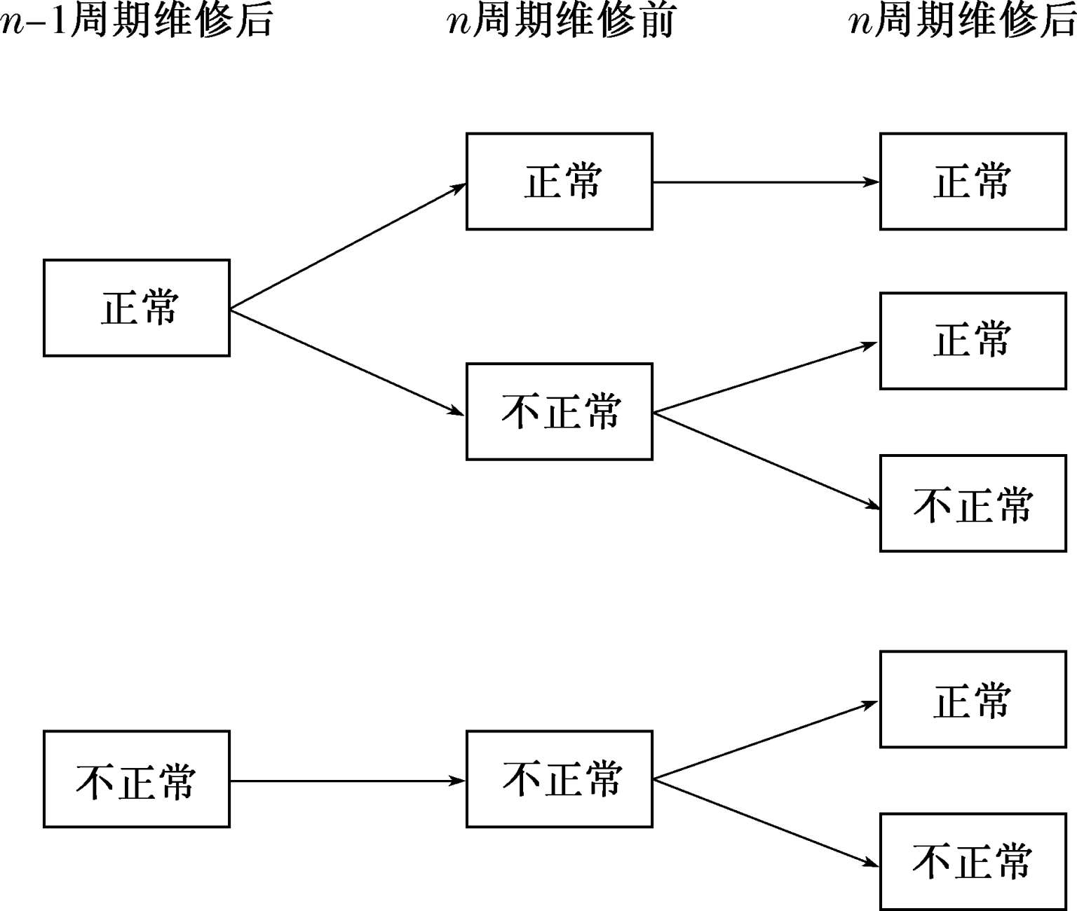 现在归纳 n -1周期维修后过度到 n 周期维修后的情况。首先 n -1周期维修结束后有正常和不正常两种工作状态,正常状态下在经历n周期后可能出现正常和不正常两种状态,再根据不同状态进行维修,维修又有一定概率成功和失败;而不正常状态下, n 周期不能工作,只能在结束后继续维修,并以 p 的概率成功维修。