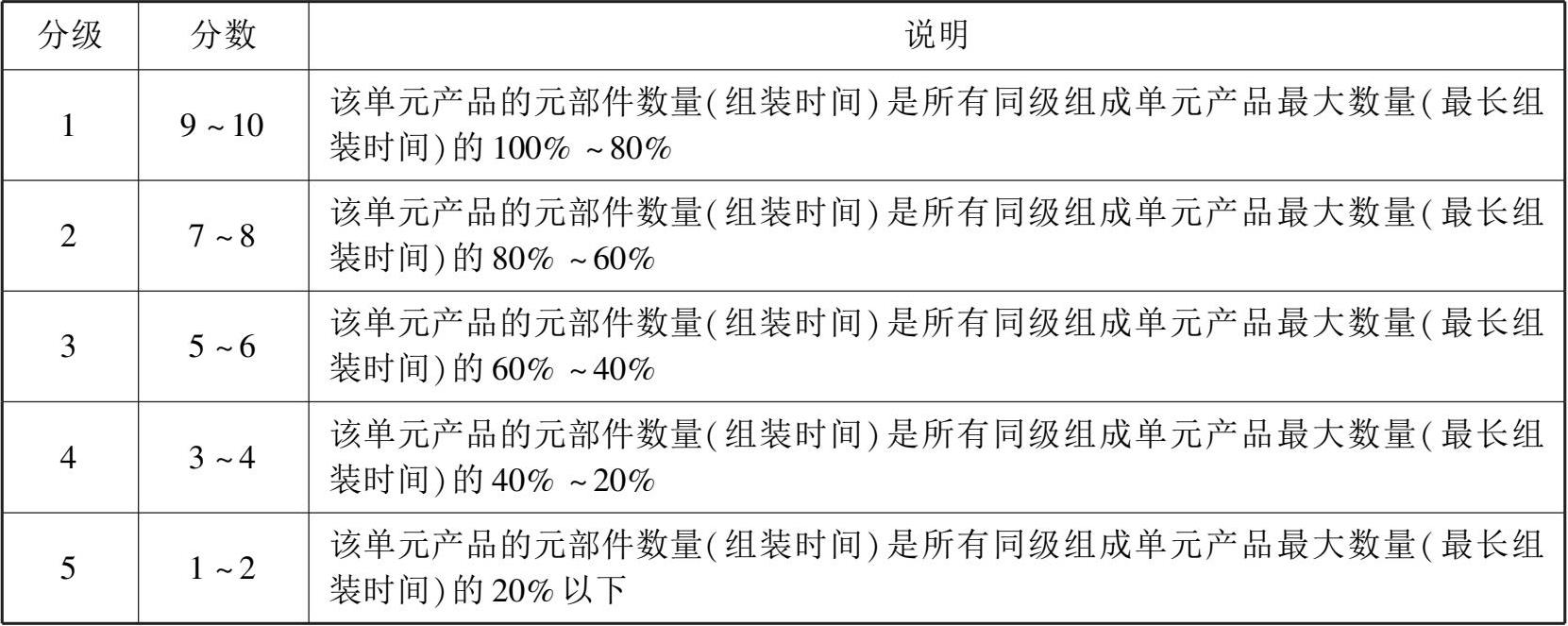 复杂程度:它是根据组成单元的元部件数量以及它们组装的难易程度来评定。最复杂的评10分,最简单的评1分,具体如表4-4所示: