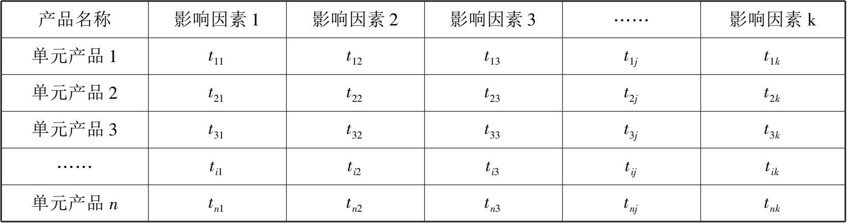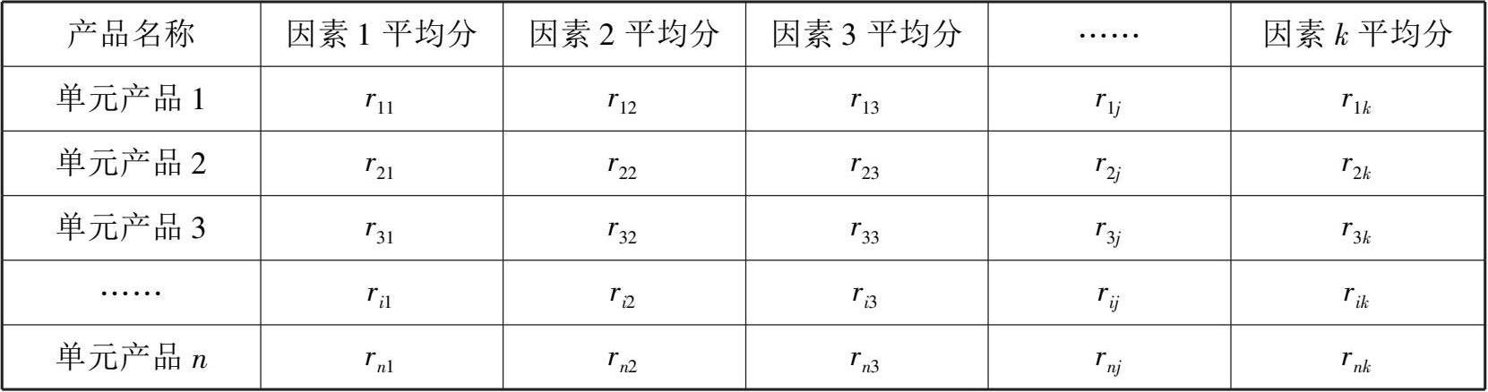 式中: r ij —第i个单元,第j个因素的平均得分; m —打分专家数量; t ij (q)—第 q 个专家给第 i 个单元产品,第 j 个因素的打分(其中 i =1,2…, n , j =1,2…, k , q =1,2…, m )。将产品的评分结果填入表4-11。
