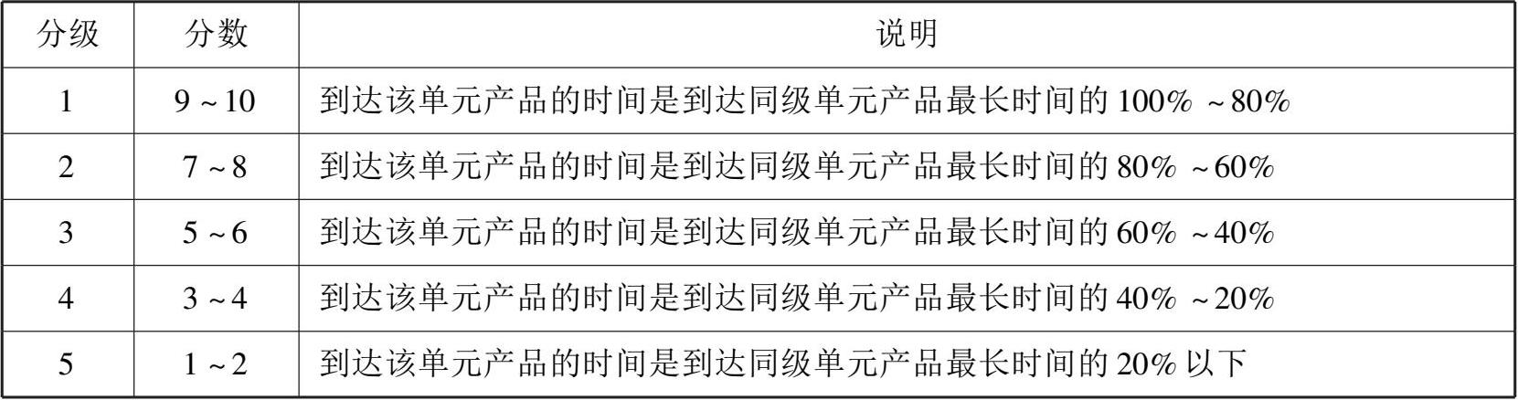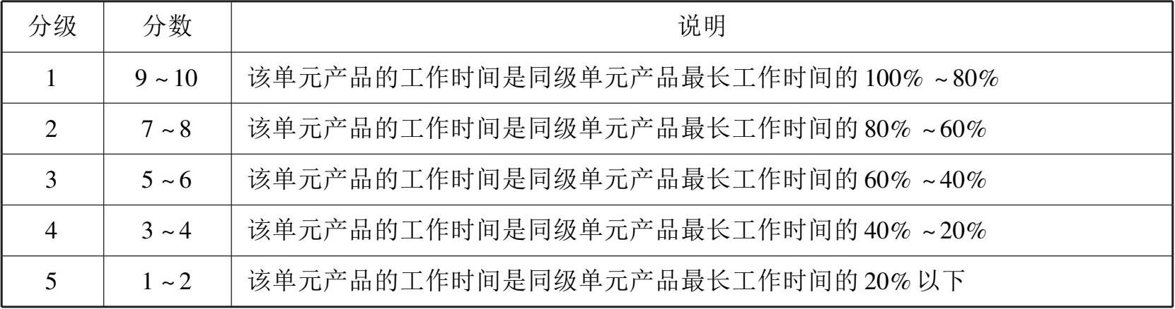 工作时间:根据单元工作时间来评定。单元工作时间最长的评10分,最短的评1分,具体准则如表4-6所示。