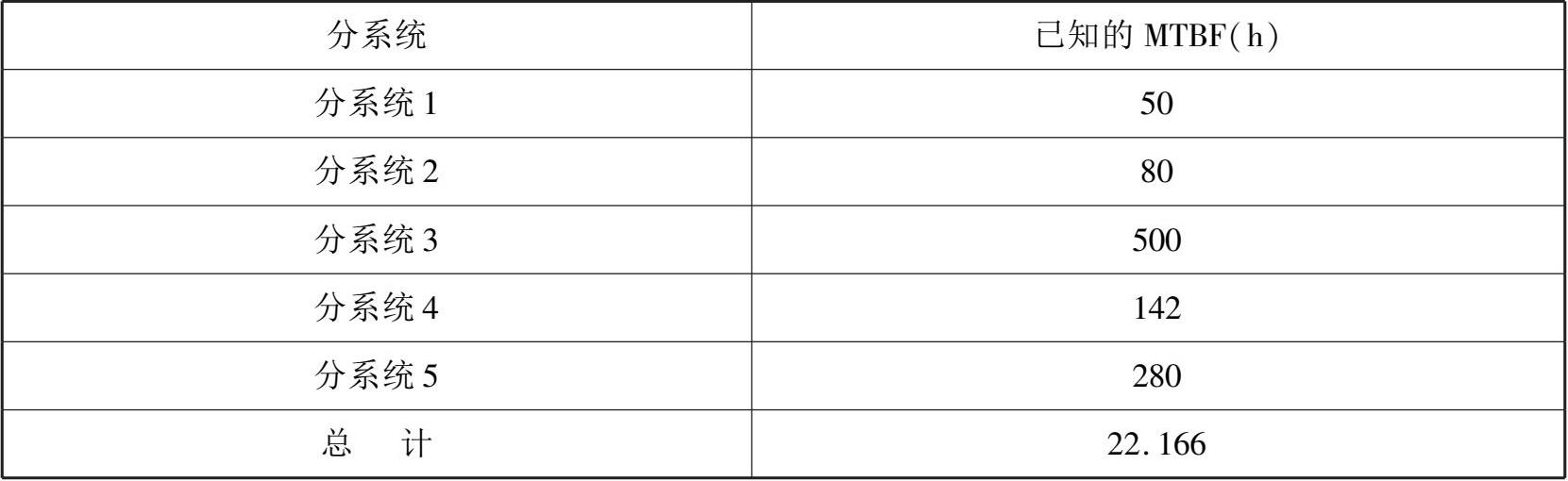 [例4-1] 某系统共由18个分系统组成,其中五个分系统是采用已使用过的产品并已知其MTBF值(见表4-12)。系统的可靠性指标规定值MTBF=2.9(h)。使用评分分配法对其余13个分系统进行分配。