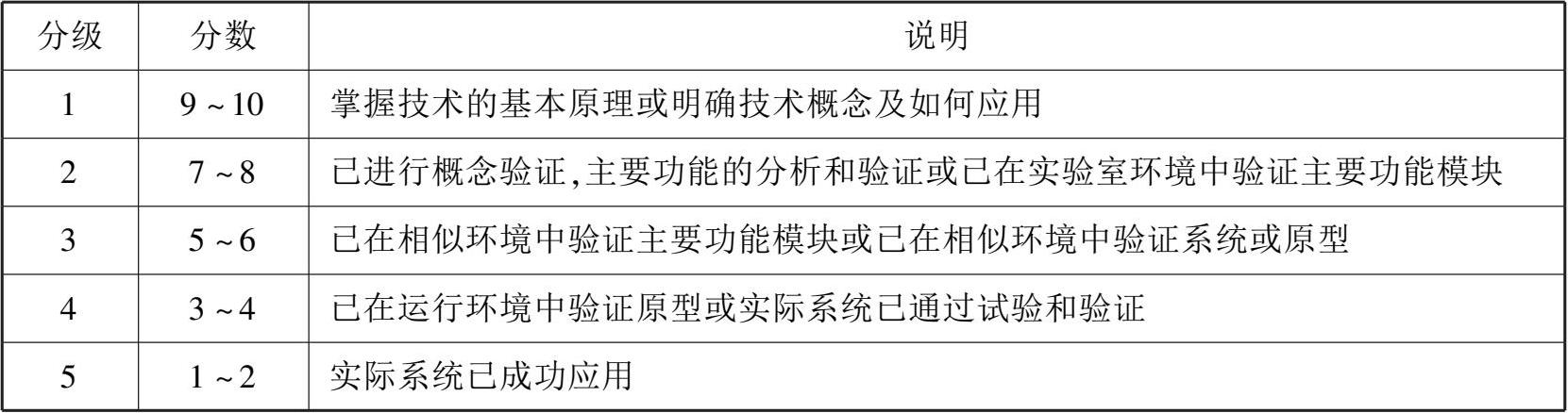技术成熟水平:根据单元目前技术水平和成熟程度评定。水平最低的评10分,水平最高的评1分,具体准则如表4-5所示。