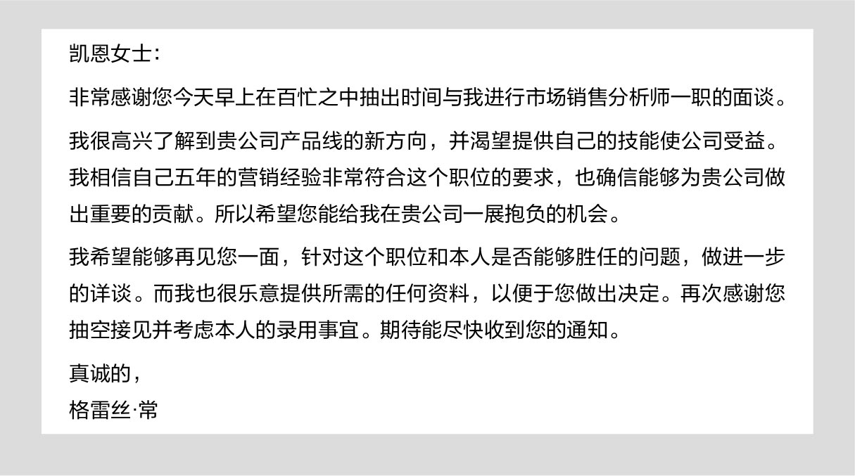 另外,在写感谢信时,一定要保证你所感谢的人的名字是正确的。有人就曾因为在感谢信中将面试官的名字写错而导致职位申请失败。细节决定成败,在细节上的失误在面试官看来是不可原谅的错误。因为,犯这种错误的人很有可能在与客户的沟通中也拼错对方的名字。(虽然和面试没什么关系,但我有一位相识多年的客户,在多年来往来的电子邮件中一直把我的姓拼错。)
