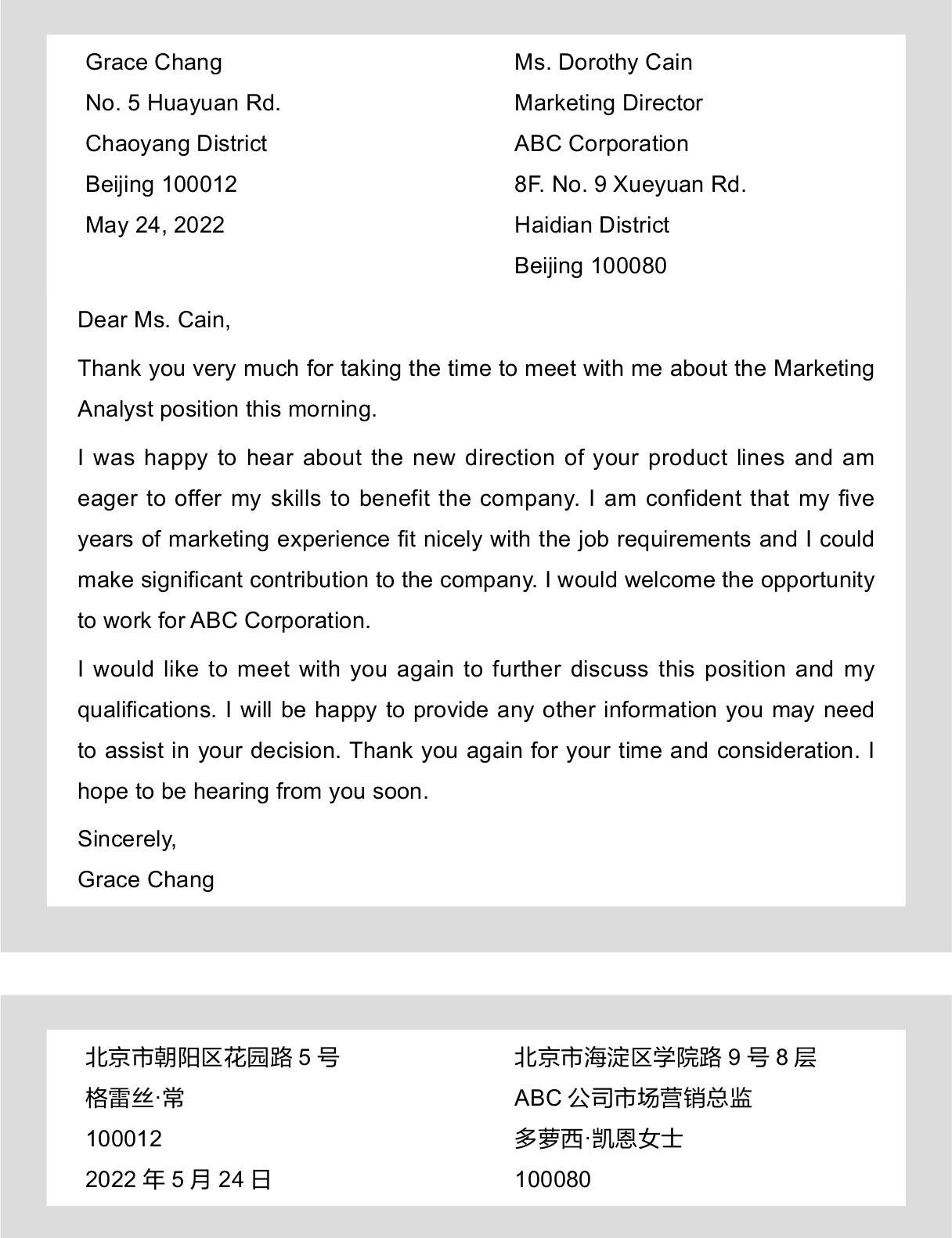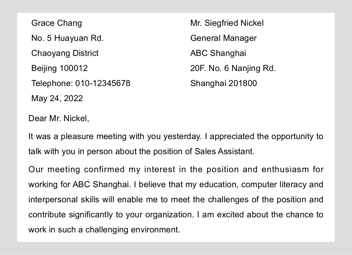 此外,感谢信要分别寄给面试自己的所有人员。此外,也应该给帮自己预约面试的人寄一封,因为以后也许还有需要对方帮忙的时候。