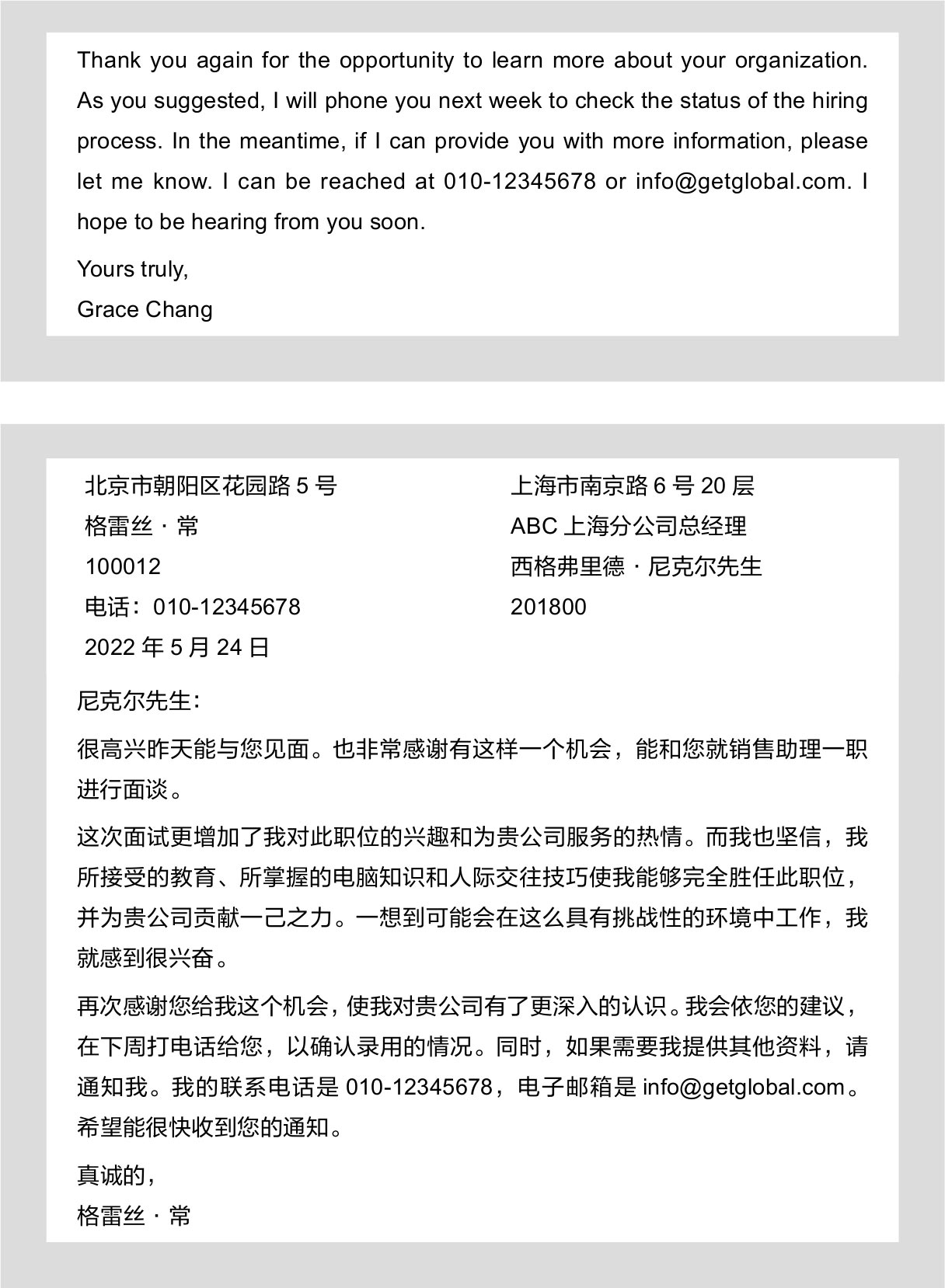 面试结束当天,最迟第二天,应给面试官发一封感谢信。因为对方可能已经面试过几十个人,这样做是为了让他/她再度想起你。此外,这也可以再次传达你对应聘职位的浓厚兴趣,同时也是“推销”自己的好机会。适时地发送感谢信,让面试官认为你是个懂得商业礼仪的人,从而对你产生好感。