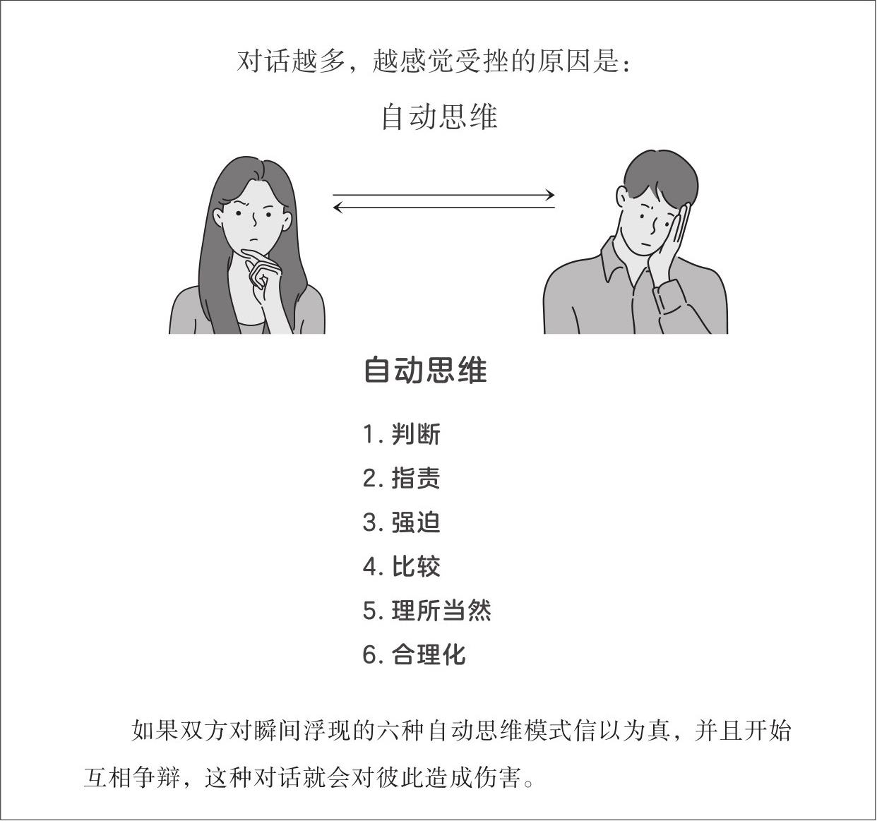男朋友也对女朋友的话感到不愉快,习惯性地做出回应,启动了阻断对话的自动思维模式。可见,自动思维才是罪魁祸首。这种模式反复的时间越长,尤其是心存不满时(所谓心情不好时),对话就会变得越困难。