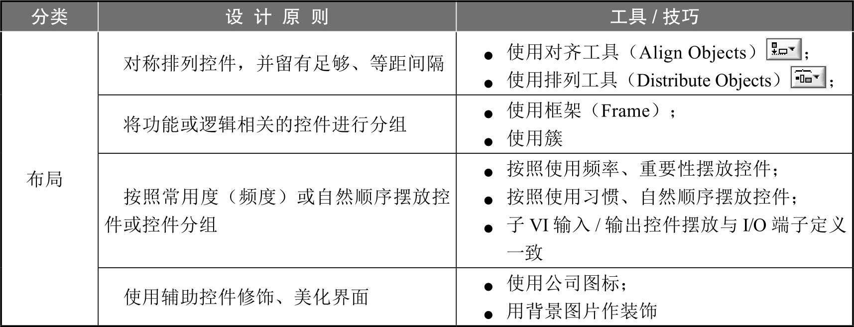 来摆放这些控件或控件的分组。表2-4列出了前面板布局的一些基本原则。