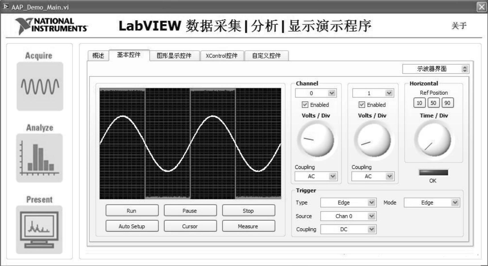 图2-6给出了一个简单的例子。在这个例子中,首先采用一致风格的字体和配色;其次,使用从左到右的习惯来安排总体布局,在左边放置采集(Acquire)、分析(Analysis)和演示(Present)操作选择按钮,在右边安排信息显示和调整按钮。另外,由于显示的信息较多,使用了Tab控件将信息进行分类,并使用一个“概述”页对信息进行汇总。“基本控件”页左下方的按钮用于采集控制,因此将其放在一起,使用相同大小、相等间隔进行排列;右边使用组合框架,将相关的控件进行分类后对称摆放,既美观又清晰。最后,在页面上添加公司图标和“关于”按钮,不仅美化了界面,还增加了关于软件更详细的信息索引。整个界面布局合理,条理清楚,是一个值得参考的例子。