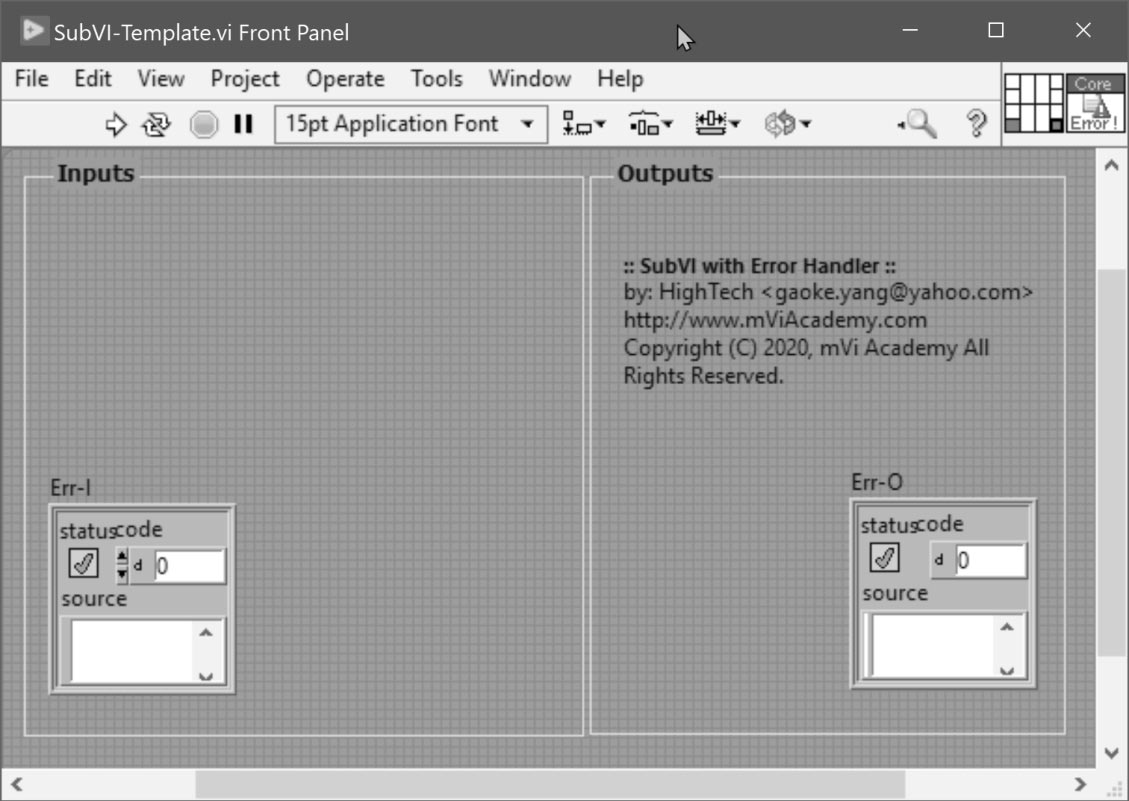 图2-7给出了一个子VI前面板的简单例子。其中虽然只包含一个错误簇输入控件和错误簇显示控件,但是还是使用了分类框将输入/输出控件分成两类,并将输入控件放置在左边,输出控件放置在右边,以便和子VI连线板的布局尽量保持一致。另外,子VI的背景色也被设置为和用户界面VI不同的深灰色。采用以上方式组织子VI中的控件,可以使设计人员对子VI的输入/输出参数一目了然。