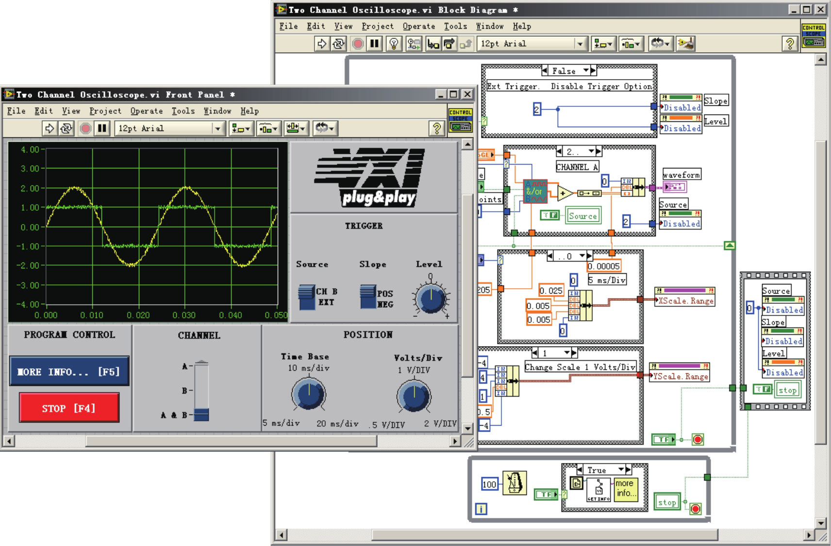 图1-4 由前面板、程序图和输入/输出端子组成的虚拟仪器