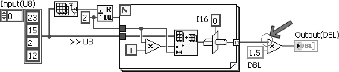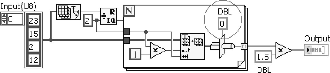 下面来看一个实际例子。在串行通信中,通常需要将8位无符号数组元素两两组合为16位整型,然后参与后续计算,图3-12给出了一种处理方法。在该例子中,程序先获取类型为8位无符号整型(U8)数组的长度,除以2之后得出循环处理次数N。随后使用For循环,将数组中的元素两两组合并转换为16位有符号整型(I16)数并组合成新数组(新数组长度减半),For循环结束后将新数组中各元素均放大1.5倍输出。由于新数组为I16类型,而放大因子是双精度浮点型(DBL),因此数组必须在乘法计算前,被强制转换成双精度浮点类型,这使得原来长度为2字节的每个数组元素变为8字节,存储缓冲增加了4倍。
