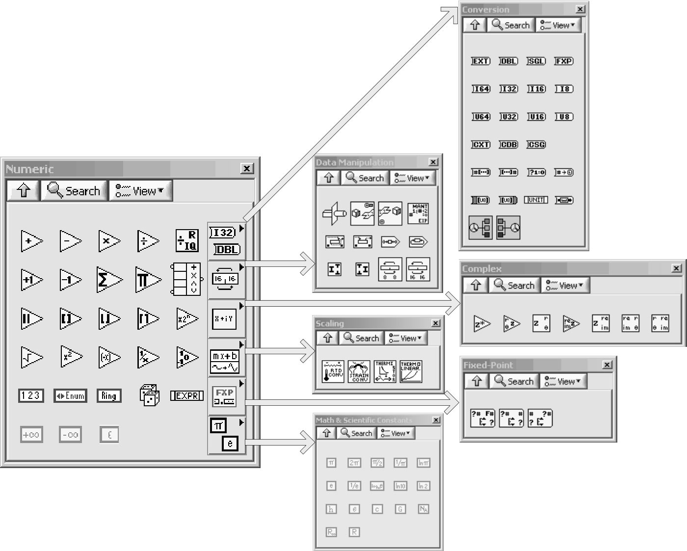 数值类型(Numeric)是程序设计中最为常用的数据类型,LabVIEW提供了多种针对数值类型的操作如图3-11所示,包括: