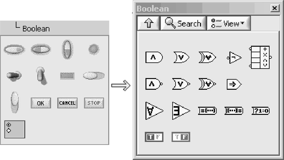 布尔(Boolean)型是最简单的控件类型,有两个可能值,真或假。虽然布尔数据本质上是以单字节整型存储,在存储大小方面没有最小的整型表示法效率高,然而布尔控件非常直观,包括按钮、开关、命令按钮、滑动开关、LED和单选按钮等。它所定义的两个明确逻辑相反状态和日常生活中很多常见现象类似,因而在设计中广泛使用。