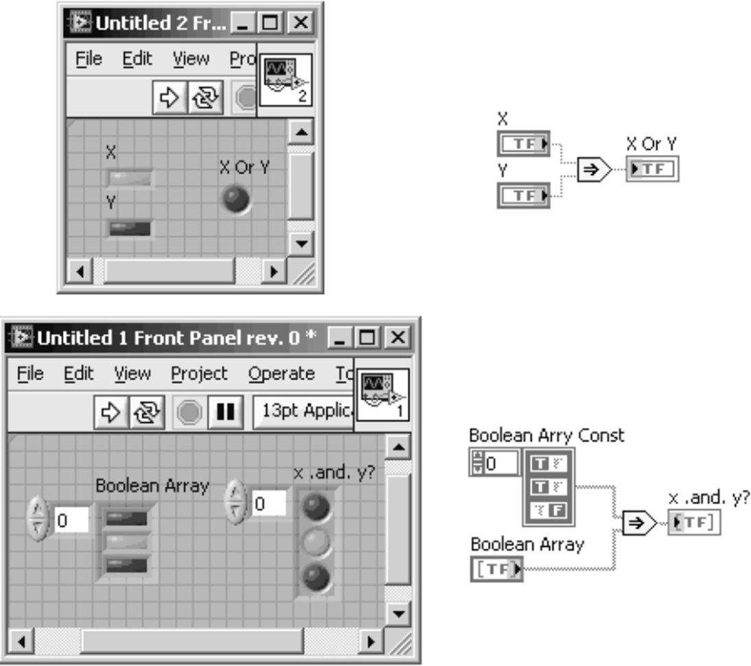 根据函数的多态性,这里所说的布尔型数据不仅包括布尔控件在后面板的节点,还包括布尔变量、布尔常量、布尔数组等多种形式。例如隐含逻辑运算Implies(当一个输入为真,另一个为假时,等于假,相当于公式“!X或Y”),既适用于布尔控件,也适用于布尔数组。图3-15中分别给出了“控件X Implies Y”的数据操作和布尔数组控件与布尔数值常量进行Implies运算的示例。