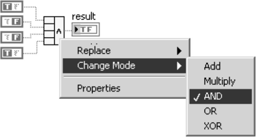 对于布尔类型的数据操作来说,有时需要对多个布尔量进行逻辑运算,为了方便处理,可以使用“逻辑混合运算”来简化操作。“逻辑混合运算”可以同时接受多个布尔或数值(多态)输入,当需要添加输入量时,通过拖动图标的尺寸会自动增加,随后通过右键菜单中的“改变模式”(Change Mode)选项来选择操作方法(图3-16)。