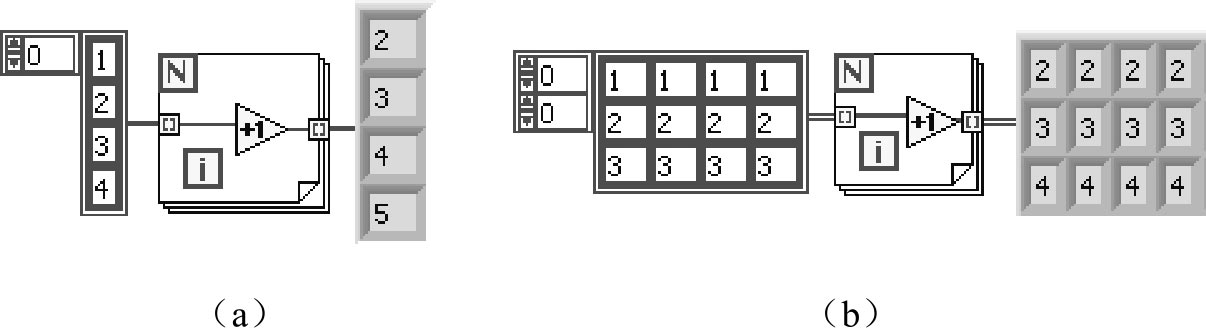 图3-32显示了在运行时使用For循环自动索引功能的方法。图3-32(a)将一维数组作为输入,使用For循环按顺序取出每个元素,加1后再按顺序组合成新数组,循环结束后新的一维数组中元素为2、3、4、5。图3-32(b)显示了以二维数组作为For循环输入,按顺序取出二维数组的每一行(一维数组)并对其中所有元素加1,随后再将一维数组重新组合成新的二维数组输出。
