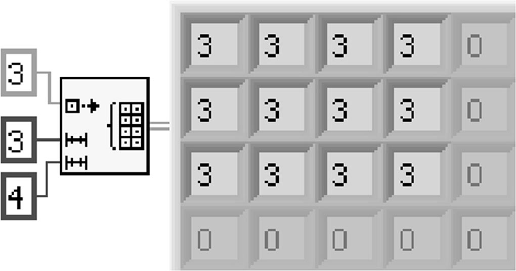 图3-31给出了运行时用常量3对一个3×4的数组进行初始化的例子,执行后每个元素的值均等于3。如果要对更多维数的数组进行初始化,则可以拖动函数图标尺寸,指定数组长度。