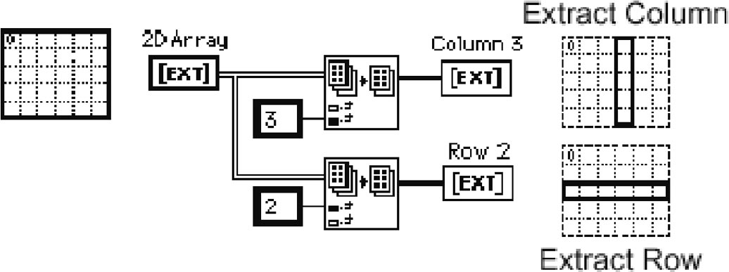 索引数组函数允许按照任何维数的组合提取子数组。图3-34显示了如何从一个二维数组中提取一个一维的行或者列数组,其中第一个索引数组函数从二维数组中提取出了第4列,第二个索引数组函数从二维数组中提取出了第3行。