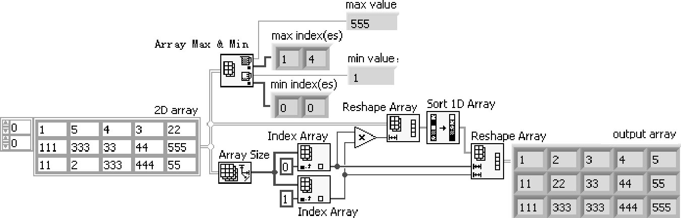 图3-39给出了一种使用数组变形函数对多维数组进行排序的例子。首先,使用“数组大小”(Array Size)函数返回二维数组的大小。该函数可以返回数组的维数和长度,如果输入数组为一维数组,则返回一维数组的长度,如果输入为多维数组,则返回一个一维数组,其元素按顺序列出数组的维数和长度。对这个例子来说,数组大小函数返回一个包含两个元素3和5的一维数组。其次,使用数组索引函数分别取出二维数组的行、列大小,通过行、列数相乘计算出数组中元素的个数。随后,使用数组变形函数将二维数组变形为长度等于二维数组元素个数的一维数组,并对其中元素使用一维数组排序函数进行排序。最后再将排序后的一维数组变形为与原二维数组有相同维数的新二维数组,新数组中的元素按照顺序从大到小进行排序。此外,例子中还演示了使用数组最值函数获取数组元素最大、最小值及其索引的情况。