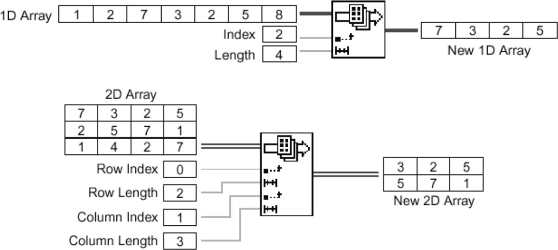 有时需要在程序中选取数组或者矩阵的某个部分,这时可以使用“数组子集”(Array Subset)函数。它可以返回从指定索引开始,指定长度的数组子集作为新数组。图3-36中分别给出了从一维数组和二维数组中提取数组子集的例子。