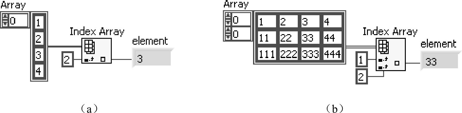 另一种方法是通过“索引数组”函数来访问数组中的元素。在程序中可以通过将常量或变量连接到索引端子来访问某个数组的元素。“索引数组”函数会自动按照数组维数扩展其索引端子。例如将一个二维数组与索引数组函数相连,它会包含两个索引端子;将一个三维数组与索引数组函数相连,它会含三个索引端子,以此类推。图3-33(a)显示了索引数组函数访问一维数组第三个元素的例子,图3-33(b)显示了索引数组函数访问二维数组第二行第三列元素的例子。注意,第一个元素的索引为0,故数组中第n个元素的索引为n-1。