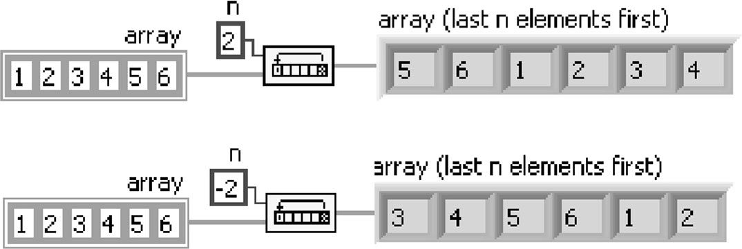 用于对一维数组进行指定次数的移位。如果指定的次数为正数,则向右移位,溢出的元素填补在数组起始位置;若指定的次数为负数,则向左移位,溢出元素填补在数组末端。例如,如果要对一个长度为N的一维数组移动-2次,则第3个元素(索引为2)变为第1个元素,第4个元素(索引为3)变为第2个元素,以此类推,而第N-2个元素为原索引为0的元素,第N-1个元素则变为原索引为1的元素。相反如果要对一个长度为N的一维数组移动2次,则旋转方向相反(图3-40)。