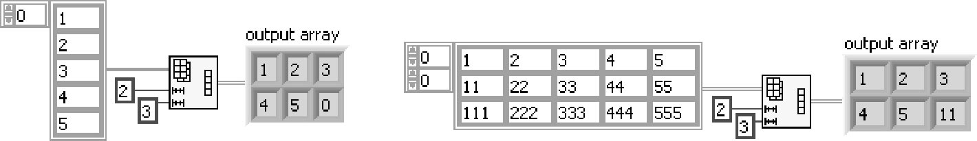 如果要在程序中获取数组中的最大、最小值,设计人员无须额外编写比较算法,LabVIEW提供了“数组最值”(Array Max & Min)函数可以方便地返回一维或多维数组元素中的最大值和最小值及其索引。然而,有时仅知道数组元素的最大、最小值还不够,可能还需要对数组中的元素进行排序。如果需要排序的数组是一维数组,则可以使用LabVIEW提供的“一维数组排序”(Sort 1D Array)函数,它可以将输入的一维数组中元素按照升序排列后返回。如果需要排序的数组为多维数组,则需要单独编写排序算法实现排序,或者先使用“数组变形”(Reshape Array)函数将多维数组变形为一维数组后排序,然后再变回多维数组。数组变形函数可以将输入数组按照指定的维数重新变形,例如将含有5个元素的一维数组变为2行3列的二维数组,或者将一个3行5列的二维数组裁剪为2行3列的二维数组,如图3-38所示。在变形过程中,如果原数组元素比变形后数组元素少,则使用数组元素数据类型的默认值填补,如果比变形后的数组元素多,则只按顺序取需要的部分。