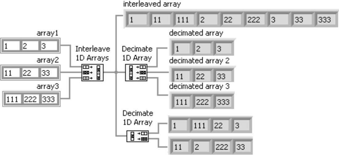 这两个函数互为逆过程,交错函数将输入的多个一维数组元素重新组合为新的一维数组,组合办法是先按顺序取各输入一维数组的第一个元素放入新数组,再按顺序取各输入一维数组的第二个元素追加在由第一个元素组成的数组之后,以此类推。输出数组的长度等于其中最短数组的长度乘以输入数组的个数,如果有多余的数组元素则舍弃。一维数组抽取函数刚好相反,根据要求输出数组的个数,先按顺序从输入数组中取值,填充输出数组的第一个元素,再填充第二个元素,以此类推。输出数组的长度等于输入数组元素的个数除以要求输出数组的个数并取整,如果有多余的数组元素则舍弃。图3-42显示了如何使用一维数组交错和抽取函数。